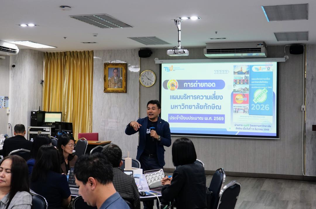 ฝ่ายยุทธศาสตร์และพัฒนาคุณภาพองค์กร มหาวิทยาลัยทักษิณ จัดโครงการ “TSU Risk Management & Internal Control Roadmap 2026 : ถ่ายทอดแผนบริหารความเสี่ยงและการควบคุมภายใน สู่การบริหารองค์กรอย่างเป็นระบบ” เมื่อวันที่ 14 มกราคม 2569 เวลา 08.00 - 16.00 น. ณ ห้องอเนกประสงค์ อาคาร 50 ปี มหาวิทยาลัยทักษิณ วิทยาเขตสงขลา โดยได้รับเกียรติจาก อาจารย์ ดร.อวิรุทธ์ ฉัตรมาลาทอง ผู้อำนวยการศูนย์บริหารความเสี่ยง จุฬาลงกรณ์มหาวิทยาลัย เป็นวิทยากรถ่ายทอดองค์ความรู้
